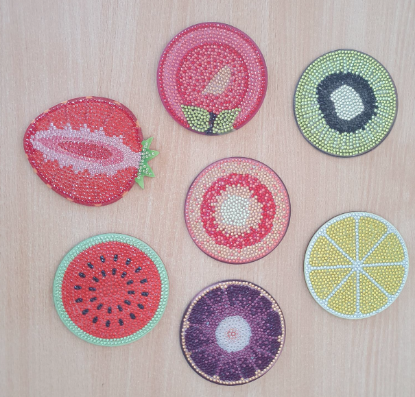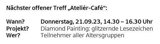Unter dem Motto „Jeder kann gestalten“ bietet der offene Treff „Ateliér-Café“ regelmäßig Raum für kreative Projekte und neue Kunstformen. Am 07. September 2023 gestaltete die Gruppe unter Anleitung der Ehrenamtlichen Bianca Veeh mit der neuen Malerei-Methode des „Diamond Painting“ sommerliche Tassen-Untersetzer aus Glitzersteinen: