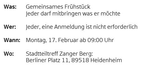 Wer möchte, darf sich gerne verkleiden. Wann: Montag, 03. März, ab 14:00 Uhr Wo: Stadtteiltreff Zanger Berg: Berliner Platz 11, 89518 Heidenheim Jeder darf mitbringen, was er möchte.Eine Anmeldung ist nicht erforderlich.